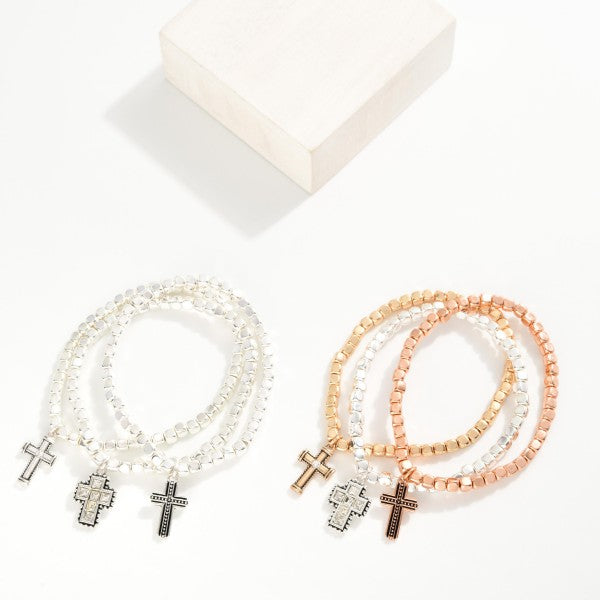 Set Of Three Beaded Stretch Bracelets Featuring Cross Charms